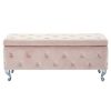 A storage ottoman can be a lavish touch to any home decor ensemble, but this ottoman is truly a one of a kind statement piece. With faux leather upholstery, a beautiful diamond patterned stitching detail, and sparkling crystal button tufting, you’ll think this piece came straight off of a fashion runway. Add to it the cabriole style legs with a chrome finish and this ottoman is sure to dazzle from any angle. Attention to detail is in all of the finishes as it includes a deep multi-purpose storage compartment and safety stop hinges to ensure that closing this ottoman will feel as soft and luxurious as it looks. Whether using it for storage or plush seating, this ottoman is sure to turn any ordinary room into something palatial. Perfect for near the door to add some bling to your entryway. Or place a clear tray on top and use as an elegant accent table.