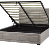 Awake or asleep, you love to enjoy the finer things in life. This panel-style king-size bed is wrapped in rich beige polyester fabric that features a lightly tufted design. It has a modern shape is clean and refined, and combines comfort and style effortlessly. Low, splayed legs raise the platform slightly while allowing the contemporary appeal to shine through. A full slat system provides the support needed for your mattress, which means you can finally say goodbye to that old box spring. Easy access lift storage offers ample space to keep all your sleeping essentials neatly organized and within reach.