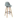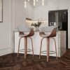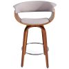 This mid-century style counter stool is crafted with a curved bentwood frame and legs in a walnut finish, and a light grey fabric seat and back with piping details. The contoured back will envelope your body with plush elegance and the 360° swivel will ensure you can carry on a conversation in any direction. The chrome-finished footrest is the perfect finishing touch.