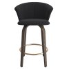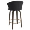 Contemporary counter height stool perfect for casual or formal seating at a kitchen island or a rec room bar. The plush cushioned seat and back will provide hours of comfort. The curved bentwood legs are finished in a rich walnut and the metal footrest is an antique gold – high fashion all the way! The rich, velvet upholstery looks elegant, is on trend, and is easy to wipe clean.