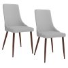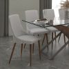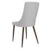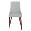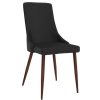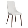 Classic mid-century modern styling with a contemporary twist. Faux leather upholstery sits beautifully on the walnut-wrapped metal legs. Clean line design is an easy match to a variety of table styles. Use in a formal or casual setting.
