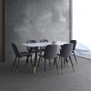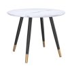 Clean, contemporary, marble-look dining table brings a true designer feel to your space. The A-line black metal legs have an aged gold accent that elevates this piece to couture status. A great match with various chairs styles and colours for a look that is uniquely your own.