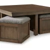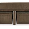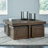 | Elevate your entertainment experience with this coffee table with stools. A functional companion for your seating area, it’s defined by a richly versatile finish. Instantly upgrade game days and movie nights—the four stools wheel out easily with casters, tucking away neatly under the table when you’re done. And with storage under the top of each stool, you can keep essentials on hand and out of sight. | ||||||||