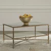 | The Cloverty coffee table gives traditional design a wonderful sense of relevance. Its details, which include embellished legs and a stretcher with a decorative center finial, are timeless classics. The aged goldtone coloration is the essence of relaxed elegance. An underlying shelf adds style, substance and functionality. | ||||