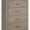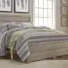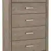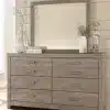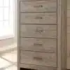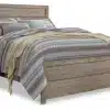 This bedroom package’s weathered driftwood finish evokes such an ethereal vibe—exactly what you need for a serene bedroom suite. Chunky moulding on the bed creates a plank-like effect, while clean lines on all pieces in this set make for a timeless look you’ll love living with for years to come. Spacious drawers and simple yet substantial hardware offer ample stylish storage for your wardrobe, while USB ports in the nightstand make charging electronics a breeze.
