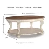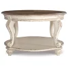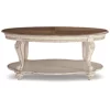 Elevating the art of traditional cottage styling, this oval coffee table is sure to serve you beautifully for years to come. Antiqued two-tone aesthetic blends a chipped white with a distressed wood finished top for added charm. Classic cabriole legs and shapely lower shelf are a lovely twist. Decorative corbels add refinement.