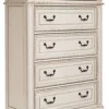 Elevating the art of traditional cottage styling, this bedroom set is your dream retreat realized. A sumptuous beauty, the upholstered bed wows with a distressed chipped white finish for heirloom appeal. Deep tufting on the cushioned upholstered headboard and footboard adds such a cozy element sure to put you at ease. Framed drawer fronts, decorative corbels, bail pulls and contrasting wood finished surfaces only add to the charm.