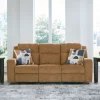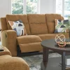 Indulgent comfort meets fashion-forward flair in this reclining sofa. Its luxuriously soft upholstery and captivating color show off your cozy yet smart style. Sleek track arms infuse a modern sensibility, while the striking accent pillows make this piece even more inviting. Simple pull tab reclining puts endless relaxation within easy reach, whether you’re lounging solo or with friends.