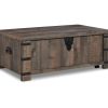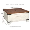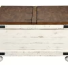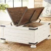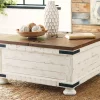 | Double take. Sporting a two-tone finish, dual-sided lid design and expansive storage space, this square coffee table takes the art of rustic farmhouse living to a new level. Designer touches include plank-effect styling, heavy distressing and industrial bracket hardware. | ||||